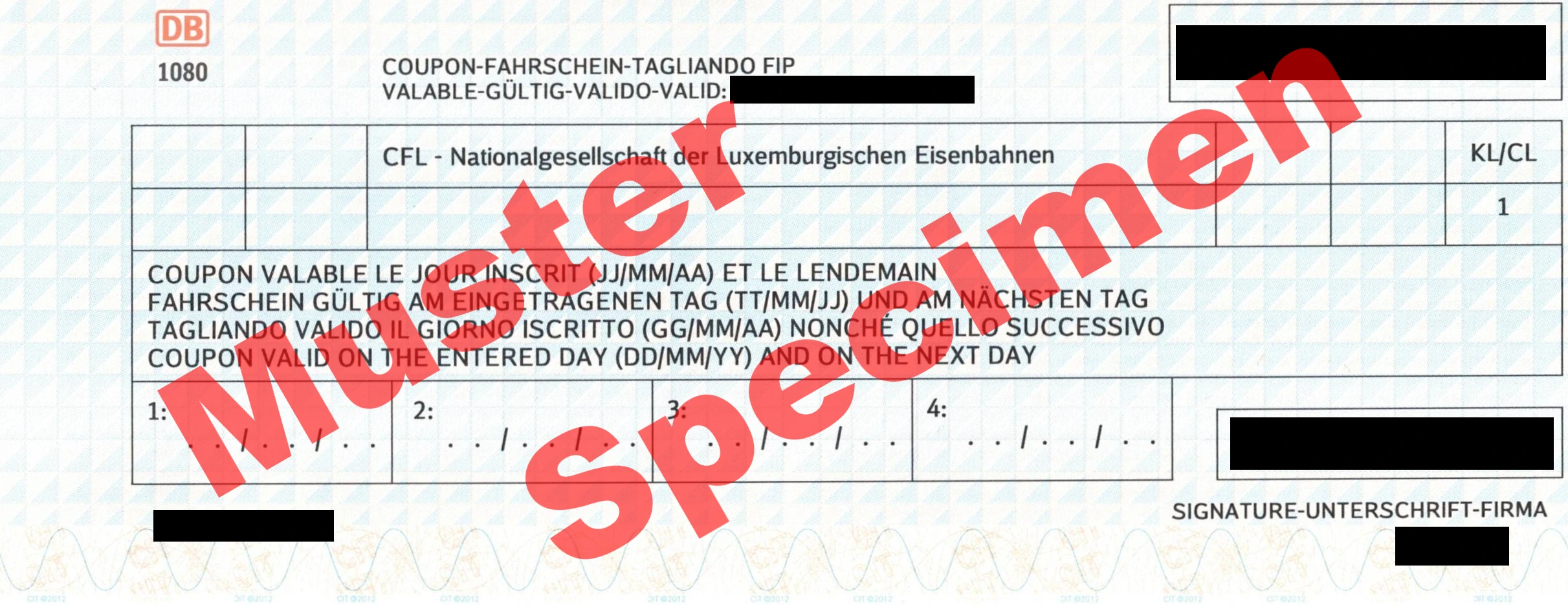 FIP Coupons (colloquially known as international free travel passes) entitle you to travel on trains operated by the company indicated on the coupon. An FIP Coupon consists of several fields. Each field is valid for two consecutive days. You must enter the first day of validity on the ticket; the ticket is then valid on that day and the following day. The different fields do not have to be used on consecutive days, but the dates must fall within the printed validity period.
